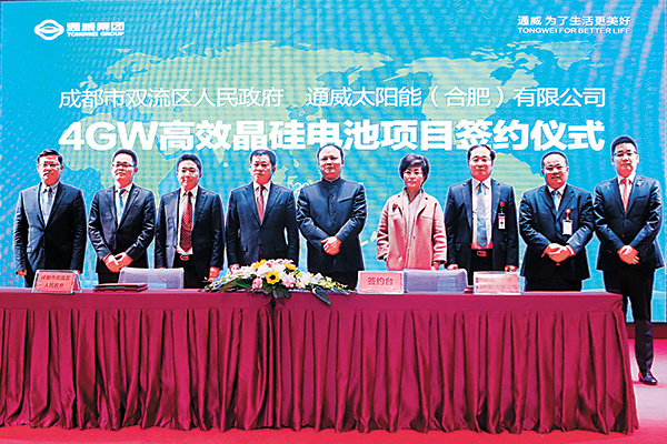 在周先毅書記、劉漢元主席等領(lǐng)導(dǎo)的共同見證下,雙流區(qū)委副書記、區(qū)長徐剛與通威太陽能(合肥、成都)有限公司董事長謝毅進(jìn)行了通威太陽能4GW高效晶硅電池項目簽約。據(jù)了解,本次項目簽約總金額預(yù)計達(dá)50億元,固定資產(chǎn)投資約34億元,分為二期、三期實施(一期1GW高效晶硅電池項目已在雙流區(qū)建成投產(chǎn)),二期、三期將分別規(guī)劃建設(shè)2GW高效晶硅電池產(chǎn)能。二期項目擬于今年2月前動工建設(shè),年底建成投產(chǎn)。三期項目將視市場需求決定投資建設(shè)進(jìn)度。項目全部建成投產(chǎn)后,通威太陽能電池片產(chǎn)能將達(dá)到7.3GW,預(yù)計每年將新增營業(yè)收入約70億元。