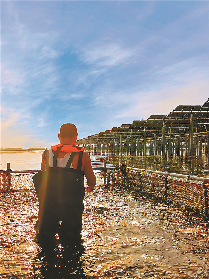 漁光物聯-漁業(yè)運營部養(yǎng)殖員史居正頂著烈日和熱潮,試用網箱給三標段精養(yǎng)區(qū)運魚苗