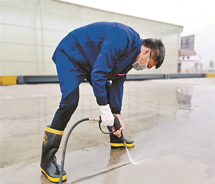 重慶通威人行部經歷何金福用高壓水槍沖洗水泥地面,保持公司嶄新容顏