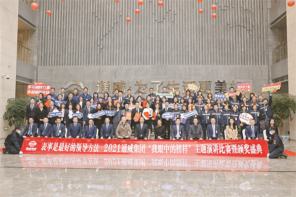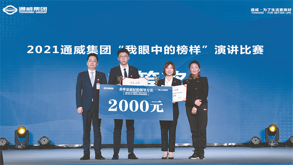 11月30日,以“表率是最好的領(lǐng)導(dǎo)方法”為主題的2021通威集團(tuán)“我眼中的榜樣”主題演講比賽暨頒獎盛典在通威國際中心隆重舉行。四川省廣播電視學(xué)會播音主持專委會會長、成都市語言藝術(shù)協(xié)會藝術(shù)顧問李蓉,成都電視臺《東周社》主講人、中國播音主持界最高榮譽“電視主持人金話筒獎”獲得者、成都市全民閱讀推廣形象大使周東,四川電視臺節(jié)目主持人、成都市語言藝術(shù)協(xié)會副秘書長海光,十一屆全國政協(xié)常委、全國人大代表、通威集團(tuán)董事局劉漢元主席,通威集團(tuán)禚玉嬌總裁,通威股份謝毅董事長、郭異忠總裁,以及集團(tuán)、股份總裁辦相關(guān)領(lǐng)導(dǎo)出席活動,集團(tuán)、股份管理總部,農(nóng)牧板塊、新能源板塊、相關(guān)多元板塊各分、子公司管理團(tuán)隊及員工代表參會。四川電視臺主持人楊林擔(dān)任盛典主持。