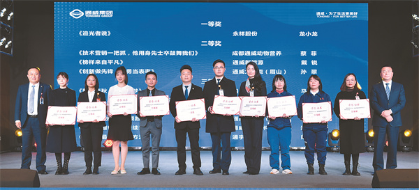 通威股份總裁郭異忠,集團(tuán)企業(yè)文化專項工作小組執(zhí)行組長、集團(tuán)副總裁黃其剛為“表率是最好的領(lǐng)導(dǎo)方法”主題征文活動獲獎員工頒獎
