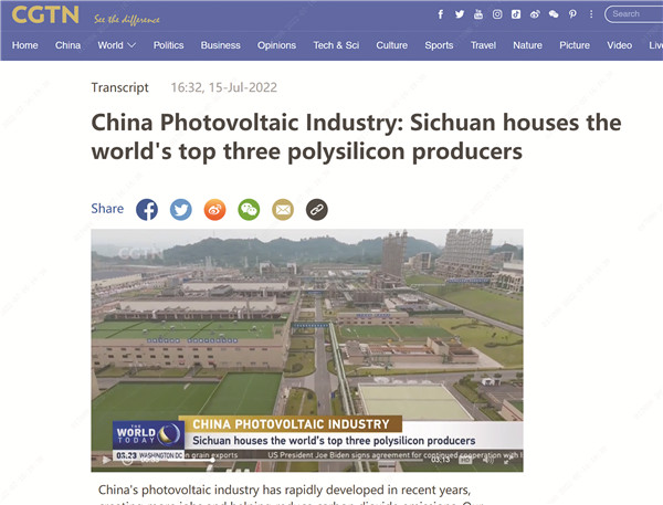 7月15日,CGTN中國國際電視臺在《The World Today》欄目播出了一則以“China Photovoltaic Industry: Sichuan houses the world's top three polysilicon producers”(中國光伏產(chǎn)業(yè):四川擁有世界前三大多晶硅生產(chǎn)商)為題的報道,向全世界推介永祥股份。