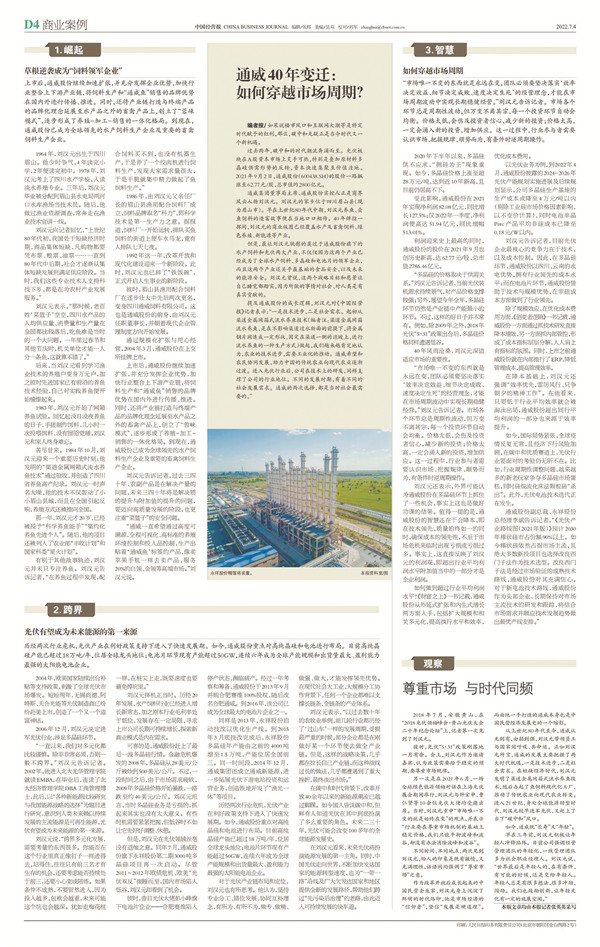 提及通威股份的成長邏輯,劉漢元主席對《中國經(jīng)營報》記者表示:“一是技術(shù)進(jìn)步,二是社會需求。起初從渠道金屬網(wǎng)箱式流水養(yǎng)魚技術(shù)做起,我們越來越肯定地認(rèn)為,農(nóng)業(yè)的技術(shù)進(jìn)步,需要工業(yè)化的推動。通威希望和農(nóng)民協(xié)同發(fā)展,助力中國的傳統(tǒng)農(nóng)業(yè)向現(xiàn)代農(nóng)業(yè)逐漸過渡。進(jìn)入光伏行業(yè)后,公司在技術(shù)上的研發(fā),同樣支撐了公司的行業(yè)地位。不同的發(fā)展時期,有著不同的社會發(fā)展需求。通威的兩次選擇,都是當(dāng)時社會最需要的。”