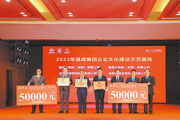 作為2023年企業文化亮點活動,通威在全集團范圍內開展年度企業文化示范基地的評選。通威太陽能(成都)有限公司、通威太陽能(合肥)有限公司、云南通威高純晶硅有限公司、成都通宇物業管理有限公司、成都通威生物科技有限公司獲評“2023年度通威集團企業文化建設示范基地”。盛典現場還對“效率優先 陽光正向 監督保障”主題征文獲獎作品進行表彰。永祥股份龍小龍榮獲一等獎、通威太陽能成都公司徐嘉等2人榮獲二等獎、通威農發張子顏等3人榮獲三等獎;通宇物業馮小蓉等10人榮獲優秀獎。