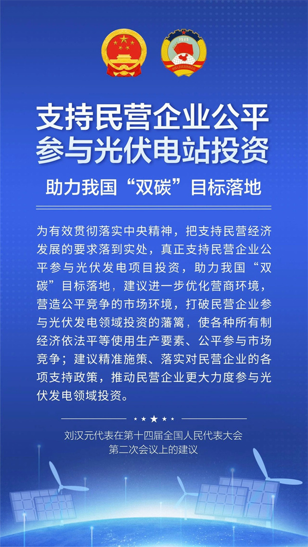 為有效貫徹落實中央精神,把支持民營經濟發展的要求落到實處,真正支持民營企業公平參與光伏發電項目投資,助力我國“雙碳”目標落地,劉漢元代表建議: