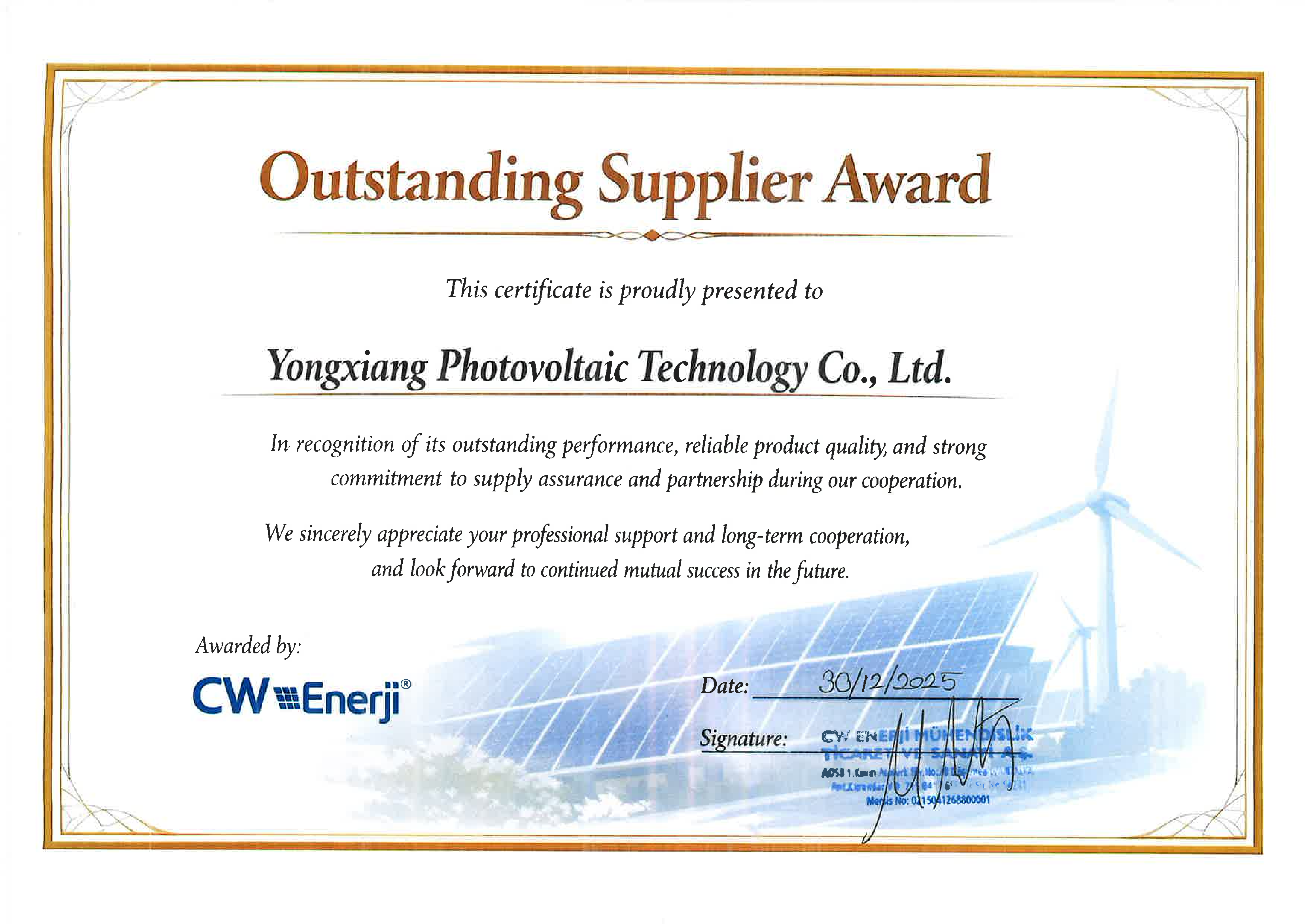 永祥光伏科技獲評土耳其CW公司年度優秀供應商獎