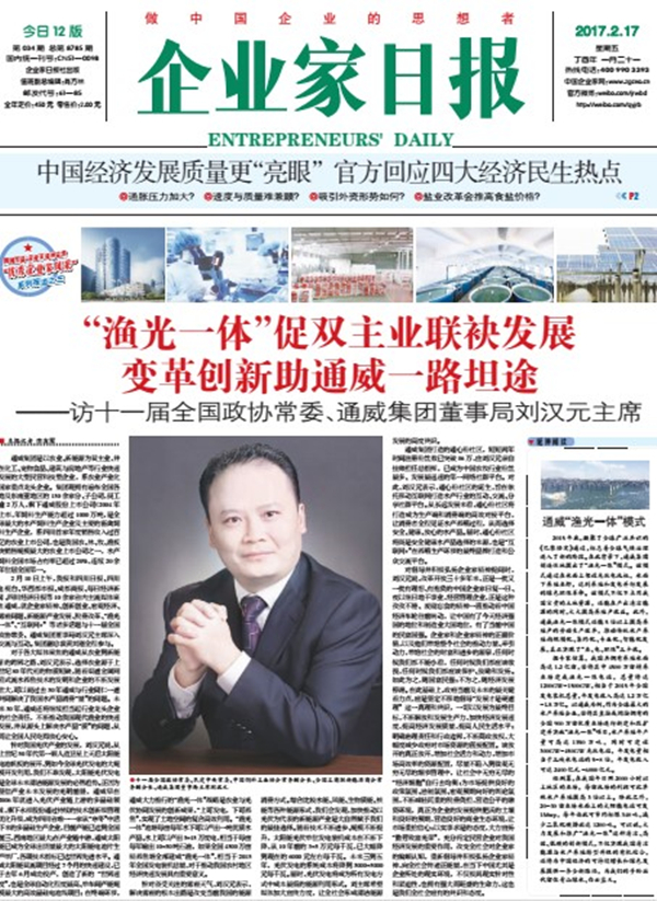 企業家日報:“漁光一體”促雙主業聯袂發展 變革創新助通威一路坦途
