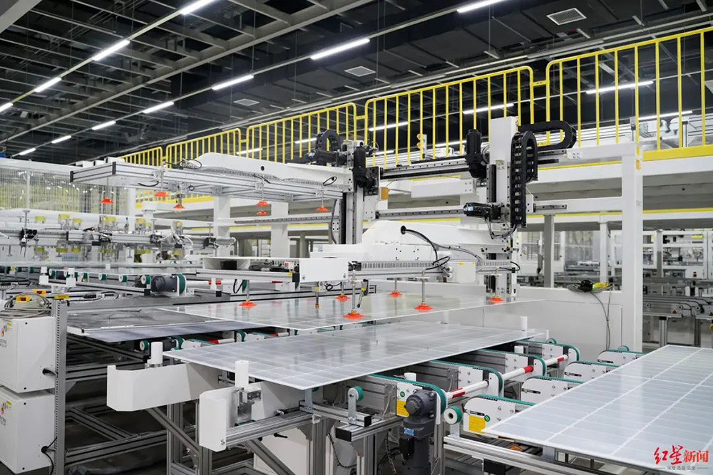 通威太陽能基地產品展廳內,不同規格的電池片被展示出來,這是構成太陽能組件的關鍵部件。企業車間內,借助自動化設備操控,鮮有人工操作身影。作為西南首個大規模組件生產基地,通威太陽能(組件)金堂基地總投資32億元,占地面積579.18畝,建成后形成年產16GW高效晶硅光伏組件產品生產能力。