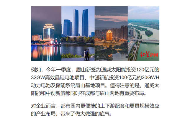 報道指出,都市圈內(nèi),既有成都市地理位置、科研院所、知名高校、營商環(huán)境等突出資源優(yōu)勢,又有德眉資土地資源、特色產(chǎn)業(yè)比較優(yōu)勢。強強聯(lián)合,便有了都市圈“研發(fā)+制造”的合作模式,讓建圈強鏈行動在都市圈內(nèi)走深走實。例如,今年一季度,眉山新簽約通威太陽能投資120億元的32GW高效晶硅電池項目。值得注意的是,通威太陽能在成都與眉山兩地有重要布局。