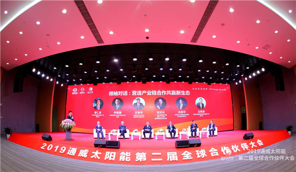 3月26日,2019通威太陽能第二屆全球合作伙伴大會在通威太陽能(成都)有限公司隆重舉行。成都市政協副主席、雙流區委書記韓軼,原國務院參事、中國可再生能源學會第七屆、第八屆理事長石定寰,中國光伏行業協會副理事長兼秘書長王勃華,隆基綠能科技股份有限公司總裁李振國,中環電子信息集團總經理、中環股份董事長沈浩平,陽光電源股份有限公司董事長曹仁賢,無錫先導智能裝備股份有限公司董事長王燕清,江蘇環太集團董事長王祿寶,雙流區政府副區長曾虎,西航港經濟開發區管委會黨工委書記、管委會主任馬駿等領導嘉賓出席。十一屆全國政協常委、全國人大代表、通威集團董事局主席劉漢元,通威集團總裁禚玉嬌,通威太陽能董事長謝毅,通威股份光伏事業部總裁陳星宇,通威股份監事會主席鄧三等通威高管出席,中央電視臺知名主持人劉棟棟擔任主持人,近百家全球頂級光伏企業精英共300余人齊聚蓉城,共同探討行業發展趨勢,共話光伏發展未來。