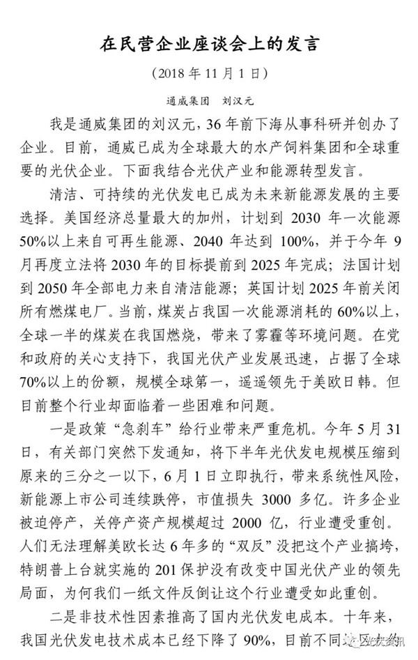 在我們國家,劉漢元先生是首次將光伏人的心聲反映到最高領導人的面前的!2018年11月1日,通威劉漢元、隆基鐘寶申、正泰南存輝和特變電工張新等光伏行業企業代表出席了民營企業座談會,在會上劉漢元先生就坐在主席的對面,把光伏行業在能源轉型中國的地位和作用、531光伏政策對行業的打擊,進行了面對面地傾訴。